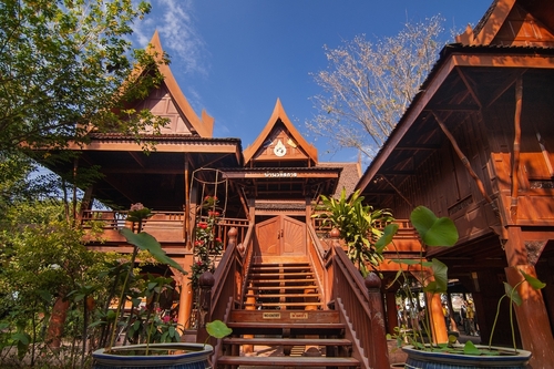 Las casas tradicionales en Tailandia suelen estar hechas de madera, sobre todo de madera de teca. Esta madera es muy resistente y hace que las casas duren mucho en el clima tropical. Los techos de estas casas son altos y las casas están elevadas sobre pilotes. Todo esto forma parte de la arquitectura tradicional tailandesa. Además, le da a las casas una función útil y una vista especial del lugar donde están.