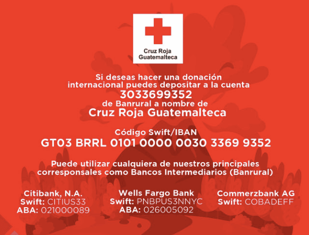 - La Cruz Roja Guatemalteca está liderando los esfuerzos de socorro y ayudando tanto a las víctimas como a los desplazados. Aquí puedes encontrar la información bancaria para donar