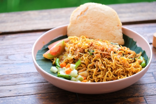 Le riz est la star incontestée de la table indonésienne. Le riz blanc cuit à la vapeur accompagne la plupart des plats en sauce, mais il est aussi la vedette de recettes comme le nasi goreng, le célèbre riz frit. On le retrouve également sous d’autres formes, comme les galettes de riz (ketupat), souvent servies lors des festivités. Les nouilles, qu’elles soient de blé ou de riz, sont tout aussi appréciées, notamment dans le plat populaire mie goreng (nouilles frites).