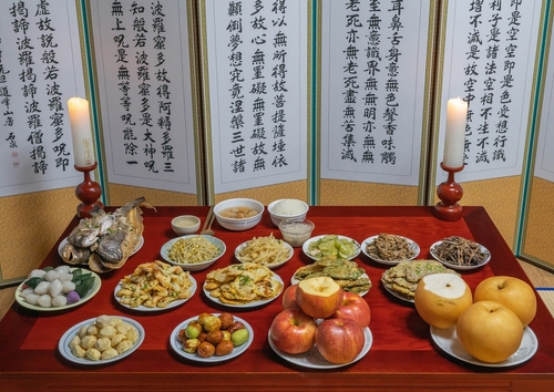 The ritual involves arranging specific foods on a ceremonial table in precise order. Rice and soup occupy the center, while fish dishes are placed on the east side and meat dishes on the west. Fruits are arranged by color, with red fruits on the east and white fruits on the west.